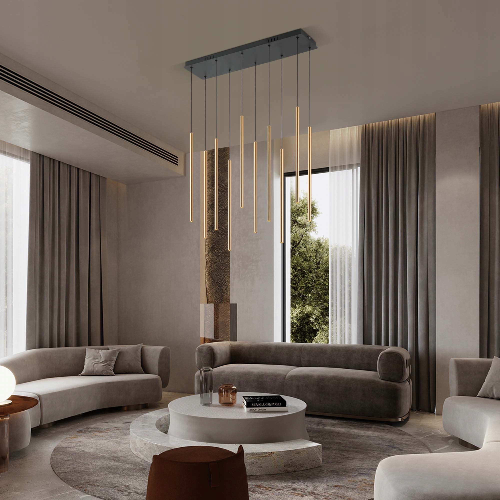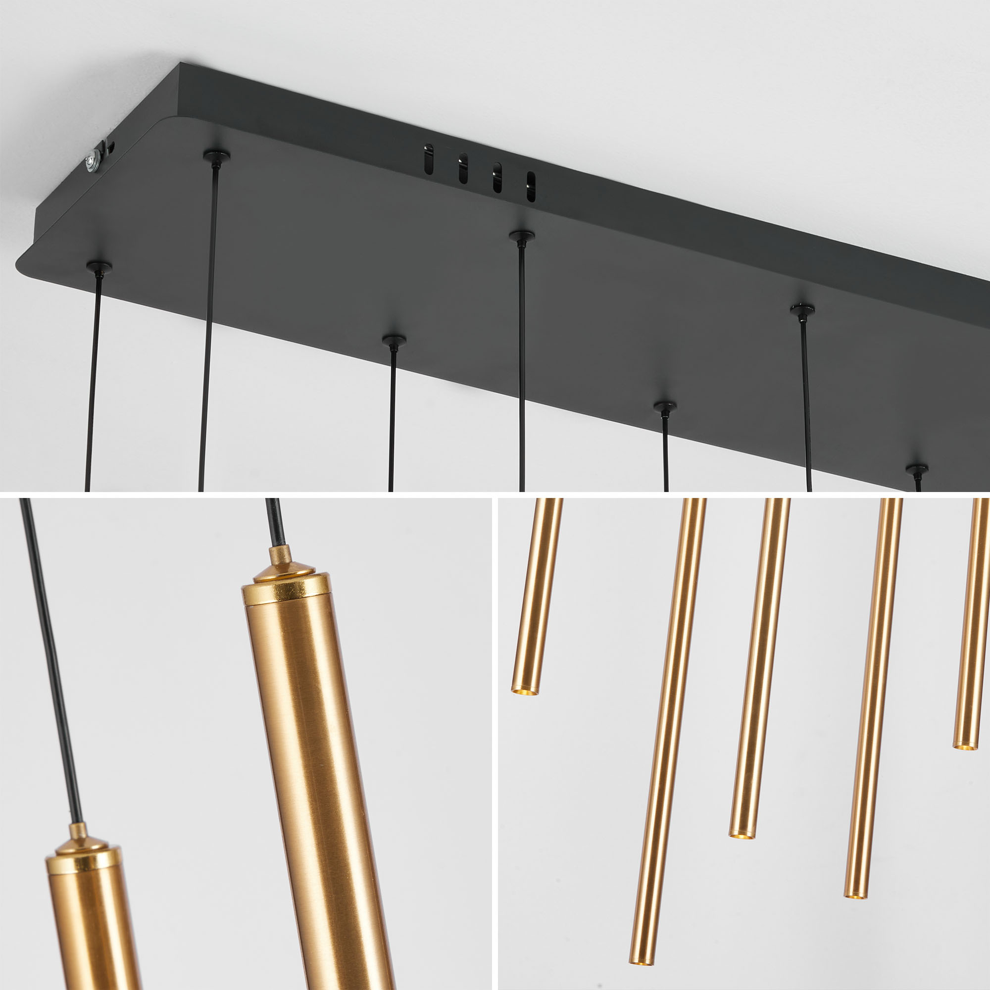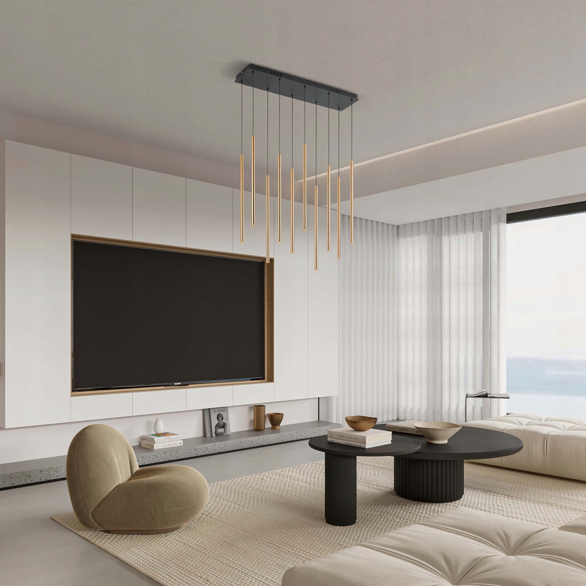 ✅ Każda z dziesięciu złotych tub posiada niezależną regulację długości przewodu, dzięki czemu możesz dowolnie ustawić ich wysokość, tworząc symetryczne lub artystyczne rozmieszczenie.