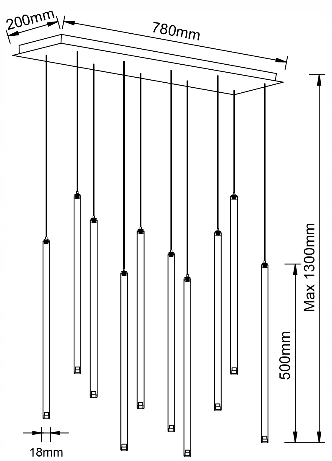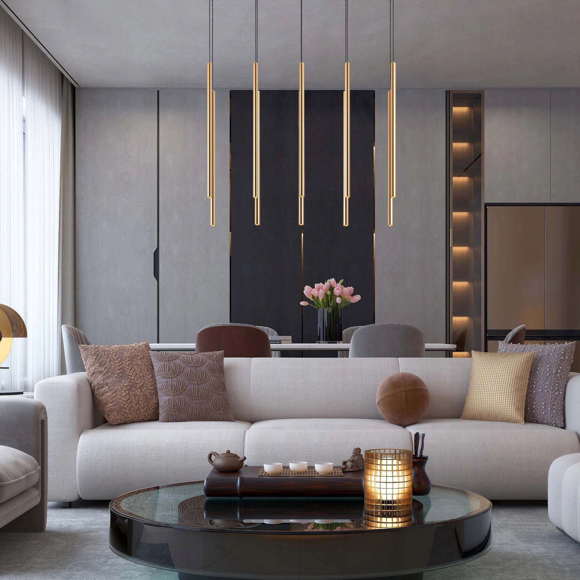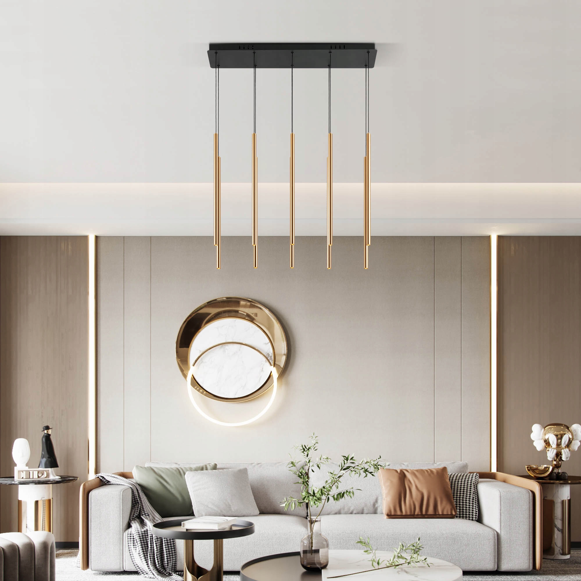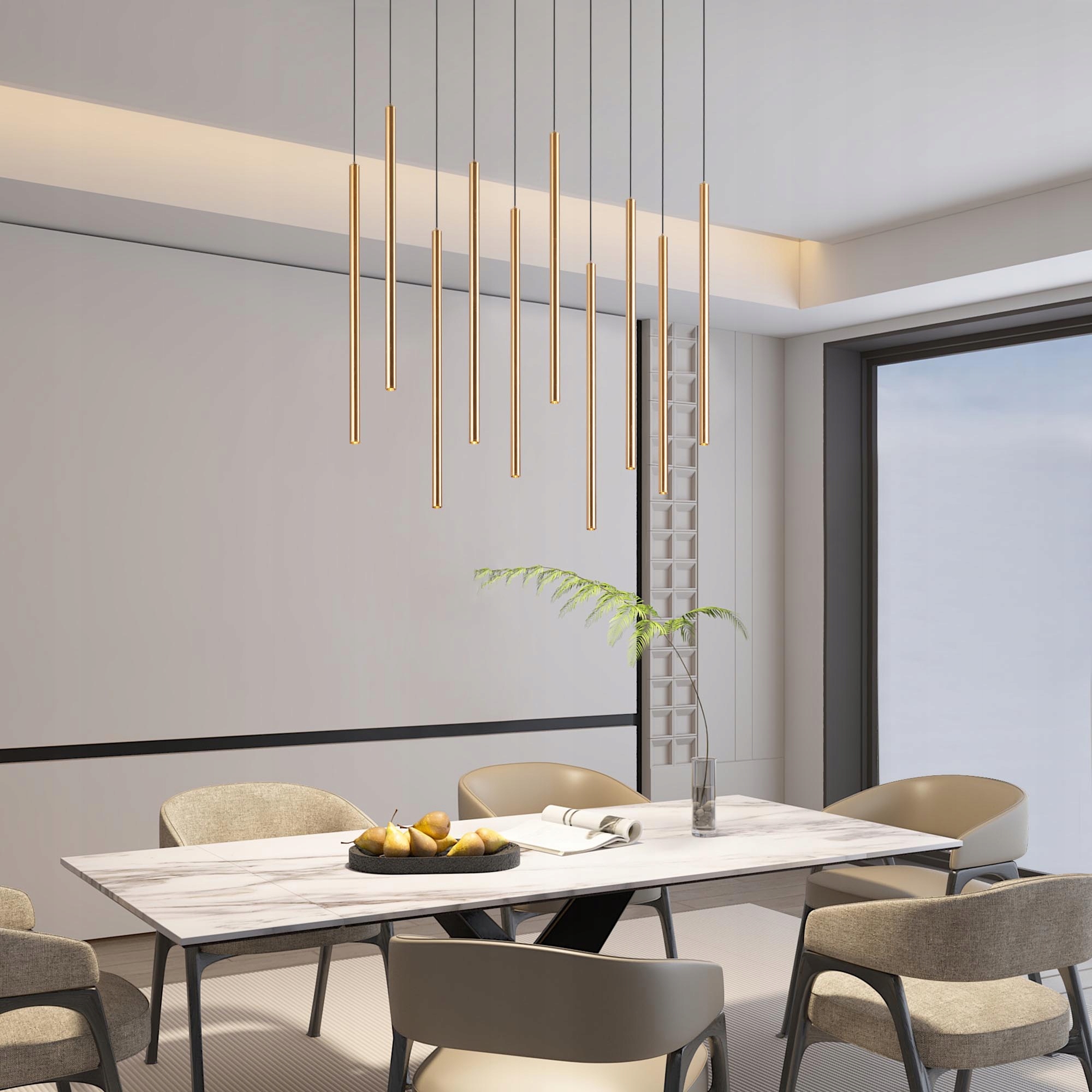 ✅ Każda z dziesięciu złotych tub posiada niezależną regulację długości przewodu, dzięki czemu możesz dowolnie ustawić ich wysokość, tworząc symetryczne lub artystyczne rozmieszczenie.
