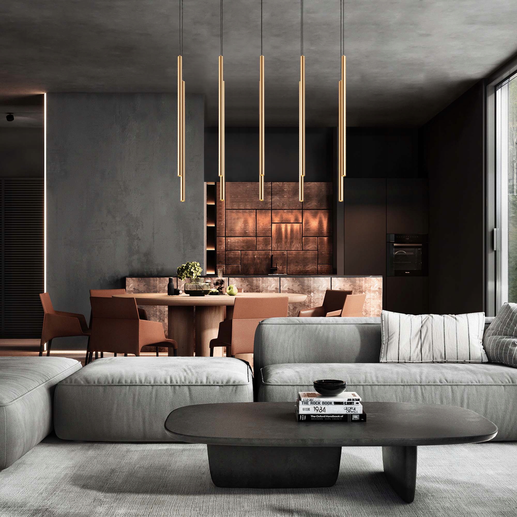 ✅ Prosta forma lampy została przełamana subtelnym akcentem w postaci złotych, smukłych rurek świetlnych, które efektownie kontrastują z czarną maskownicą sufitową. Taka kombinacja kolorów nadaje wnętrzu wyrafinowany, ale zarazem ciepły charakter.