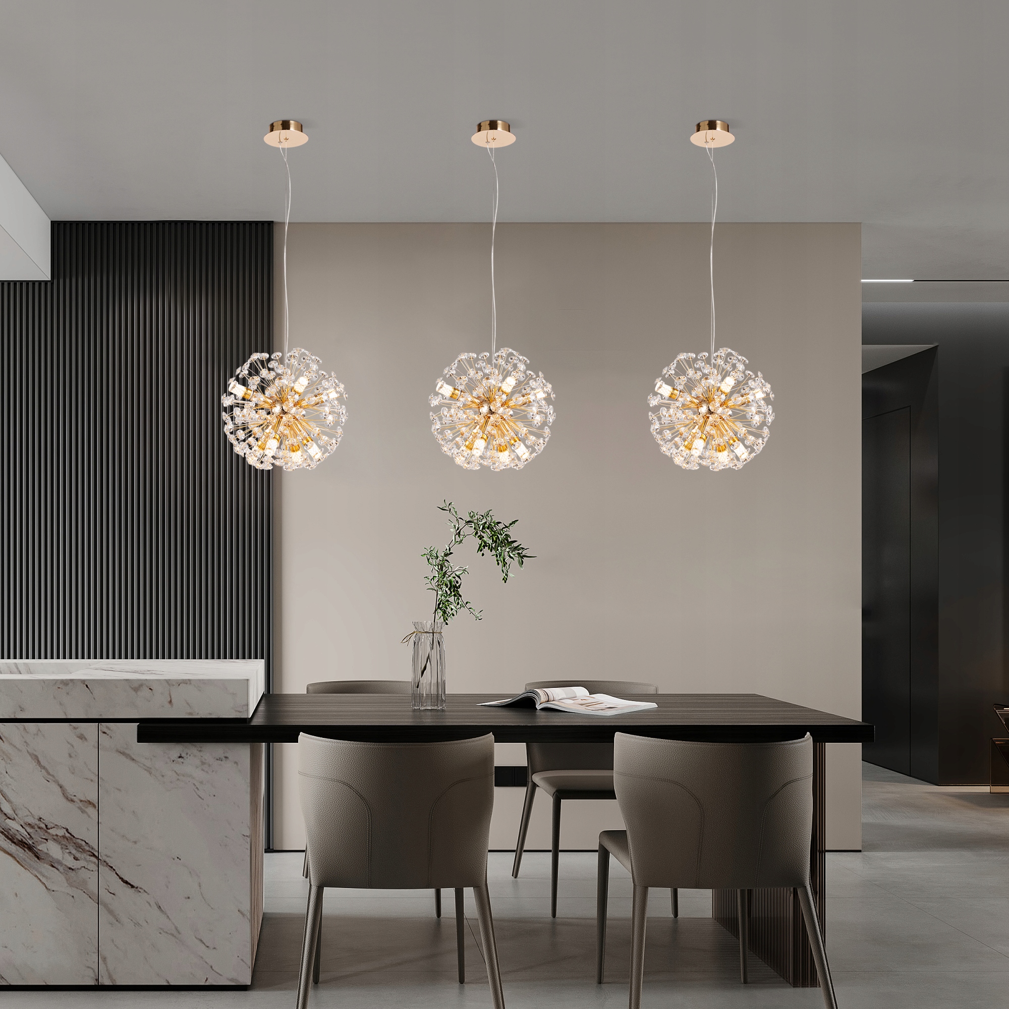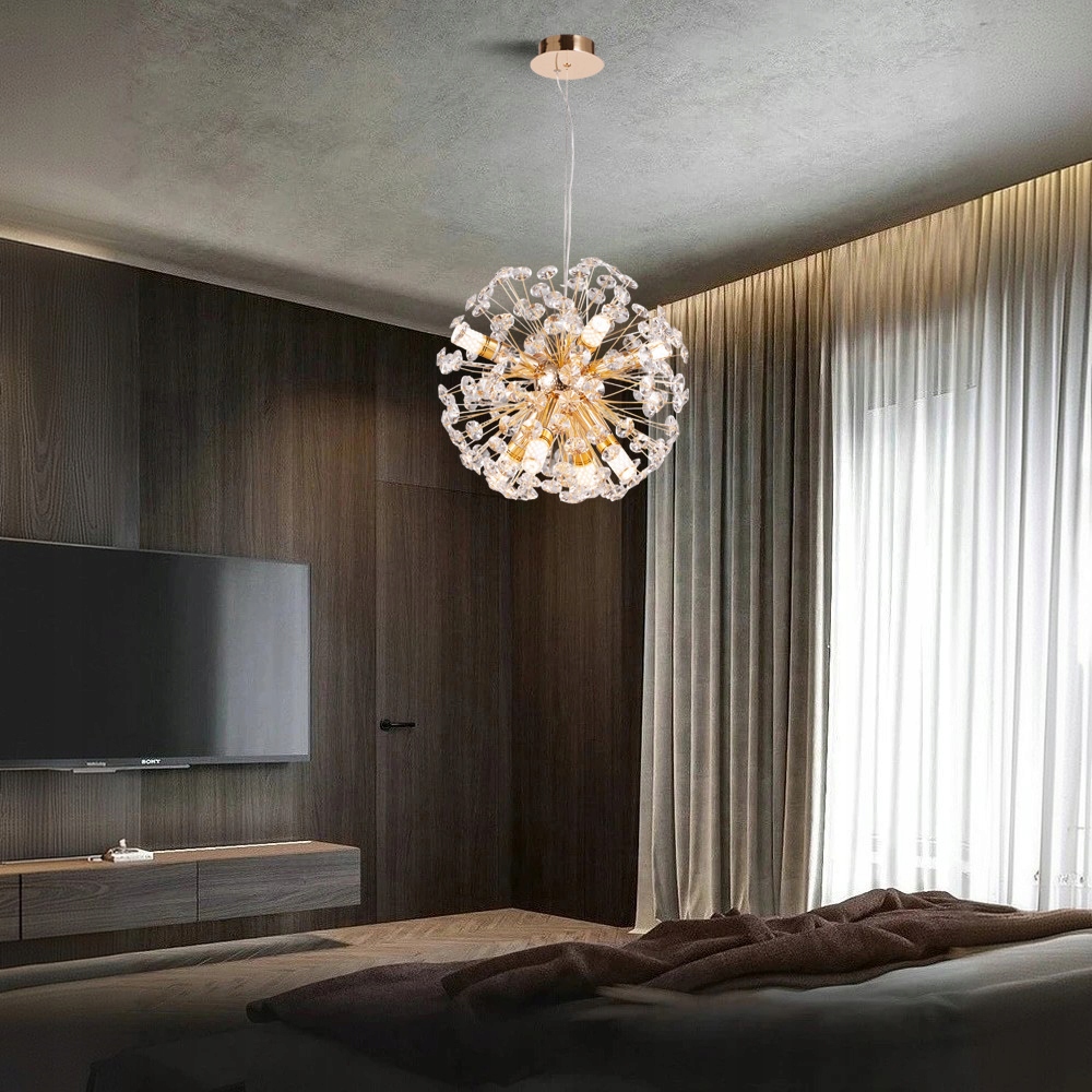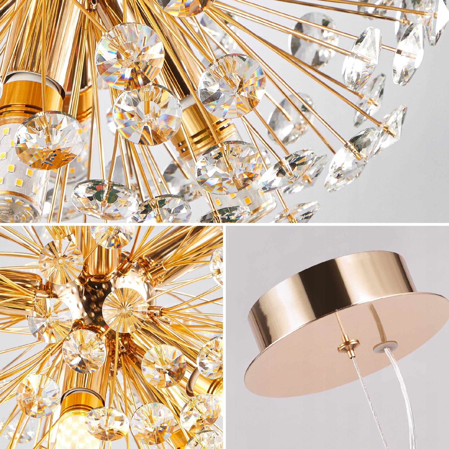 ✅ Ta niezwykła lampa sufitowa to połączenie elegancji, nowoczesności i artystycznego rzemiosła. Jej kulista forma została utworzona z licznych, misternie wykonanych gałązek ze stali o złotej, chromowanej powierzchni. Filigranowa konstrukcja przypomina strukturą kwiatowe pręciki z których każdy zakończony jest wielopłaszczyznowym, szlifowanym kryształkiem. Dzięki temu całość tworzy efekt przestrzennej, lekkiej kuli, która już sama w sobie stanowi wyjątkową dekorację wnętrza.