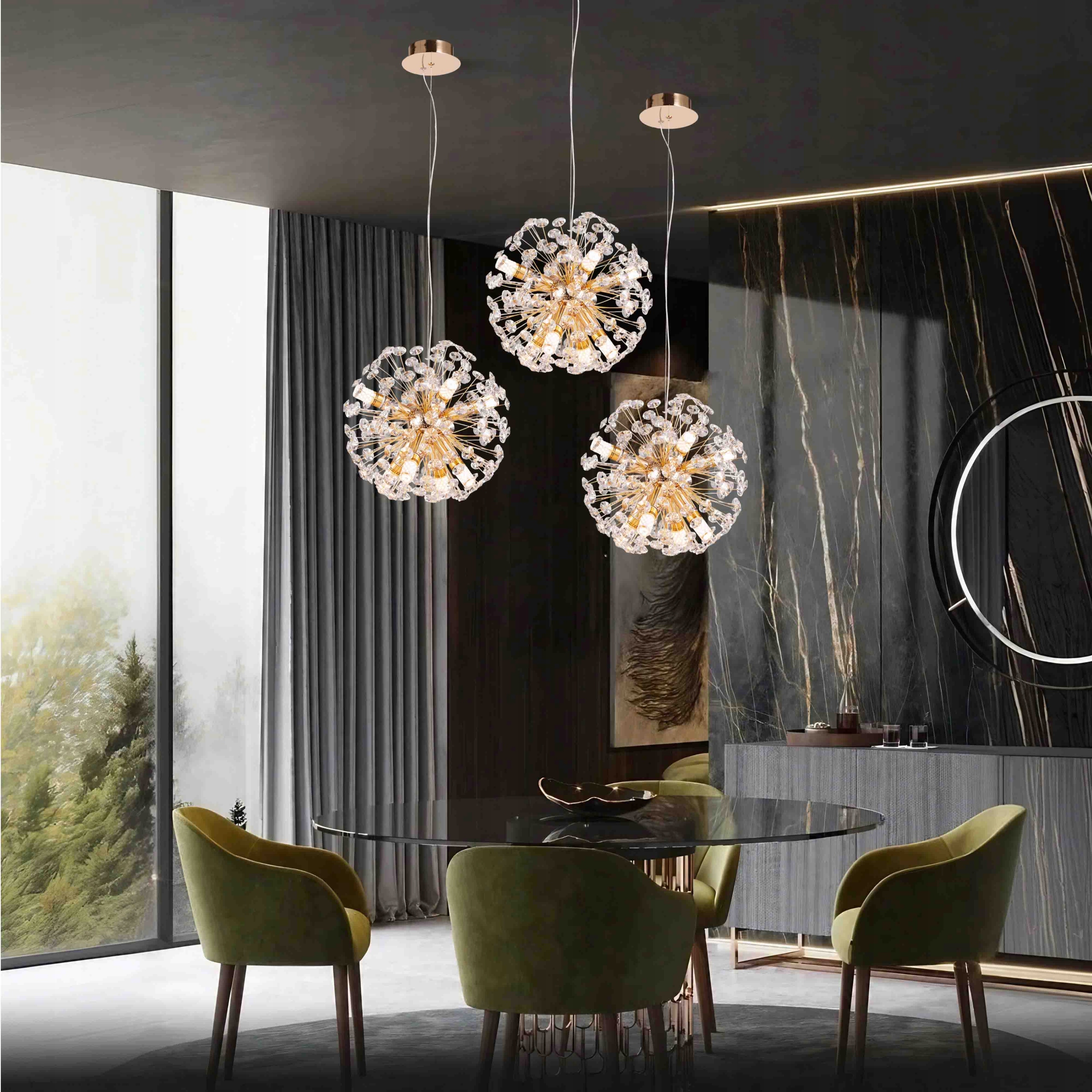 ✅ Lampa oferuje pełną regulację wysokości zawieszenia, co pozwala idealnie dopasować ją do warunków i aranżacji pomieszczenia. Świetnie sprawdzi się zarówno jako pojedynczy punkt centralny nad stołem, jak i w zestawieniu kilku lamp tworzących spektakularną kompozycję świetlną. Dzięki rozmiarowi o średnicy 40 cm i sugerowanemu zastosowaniu w pomieszczeniach o powierzchni 12–15 m², stanowi idealne rozwiązanie do salonu, jadalni lub reprezentacyjnego holu.